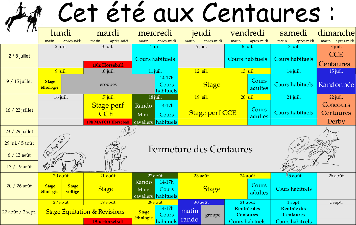 - Équitation tous niveaux: 12 et 13 juillet, 21, 23 et 24 août